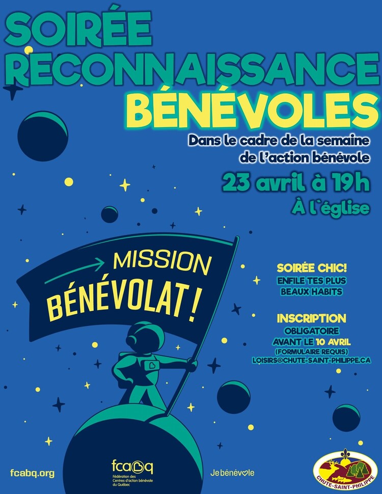 Dans le cadre de la Semaine de l'action bénévole, qui se tiendra du 19 au 25 avril, les élus et employés de la Municipalité de Chute-Saint-Philippe ont le plaisir de vous convier à une soirée de reconnaissance des bénévoles.